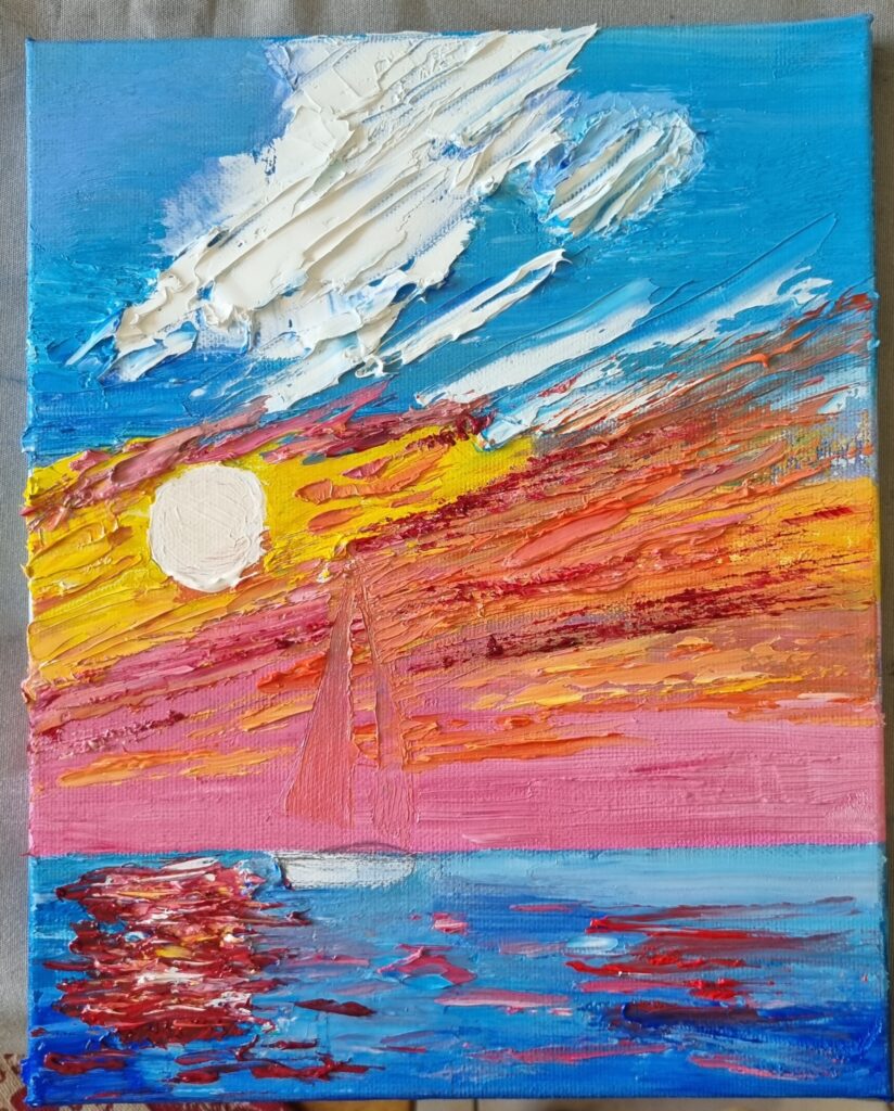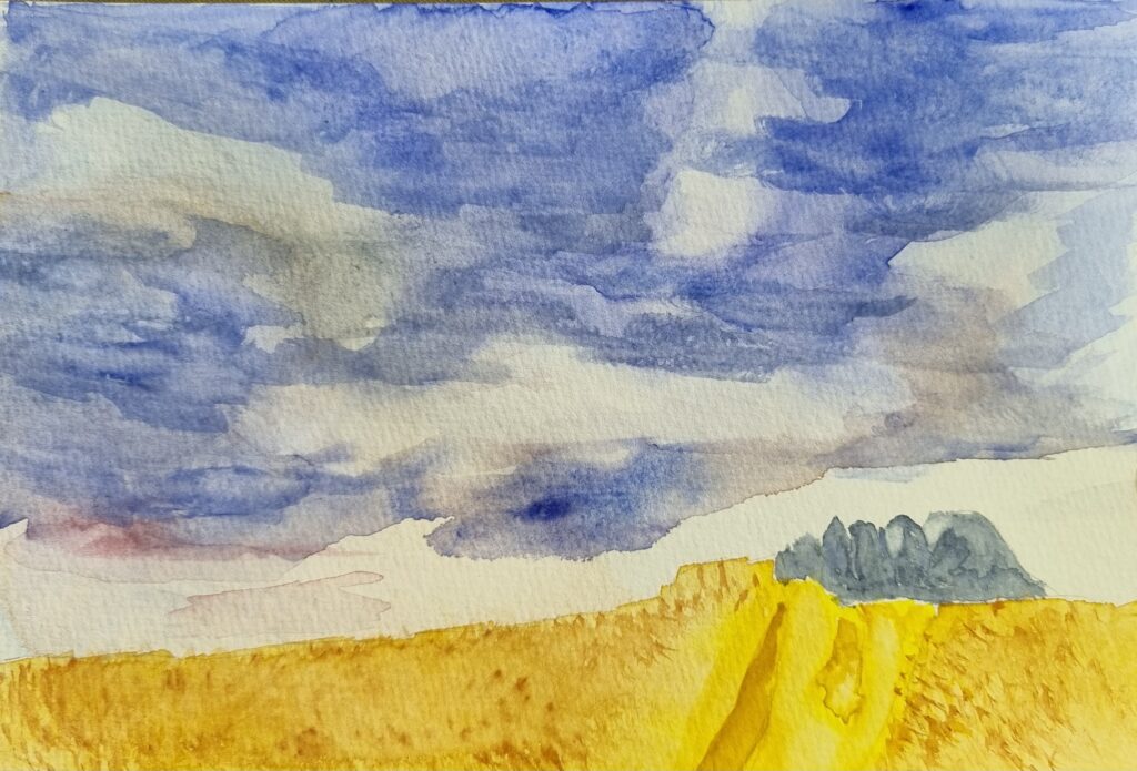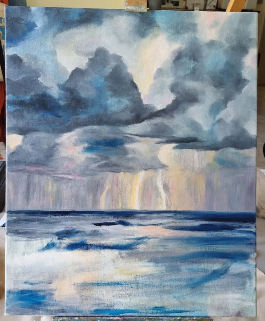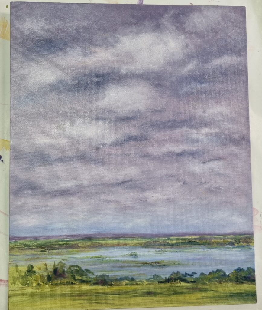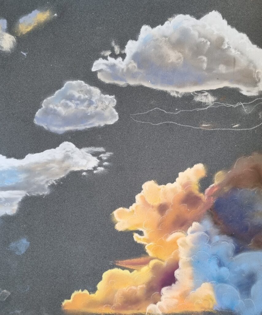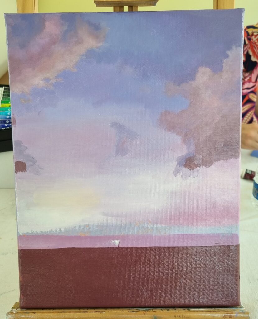 - En général on peint le ciel avec 2 bleus différents sans les nuages puis on les rajoute après, sauf s’ils ont gros .