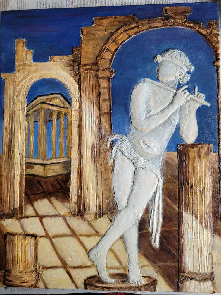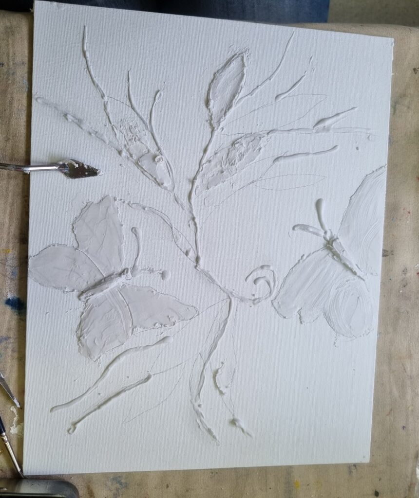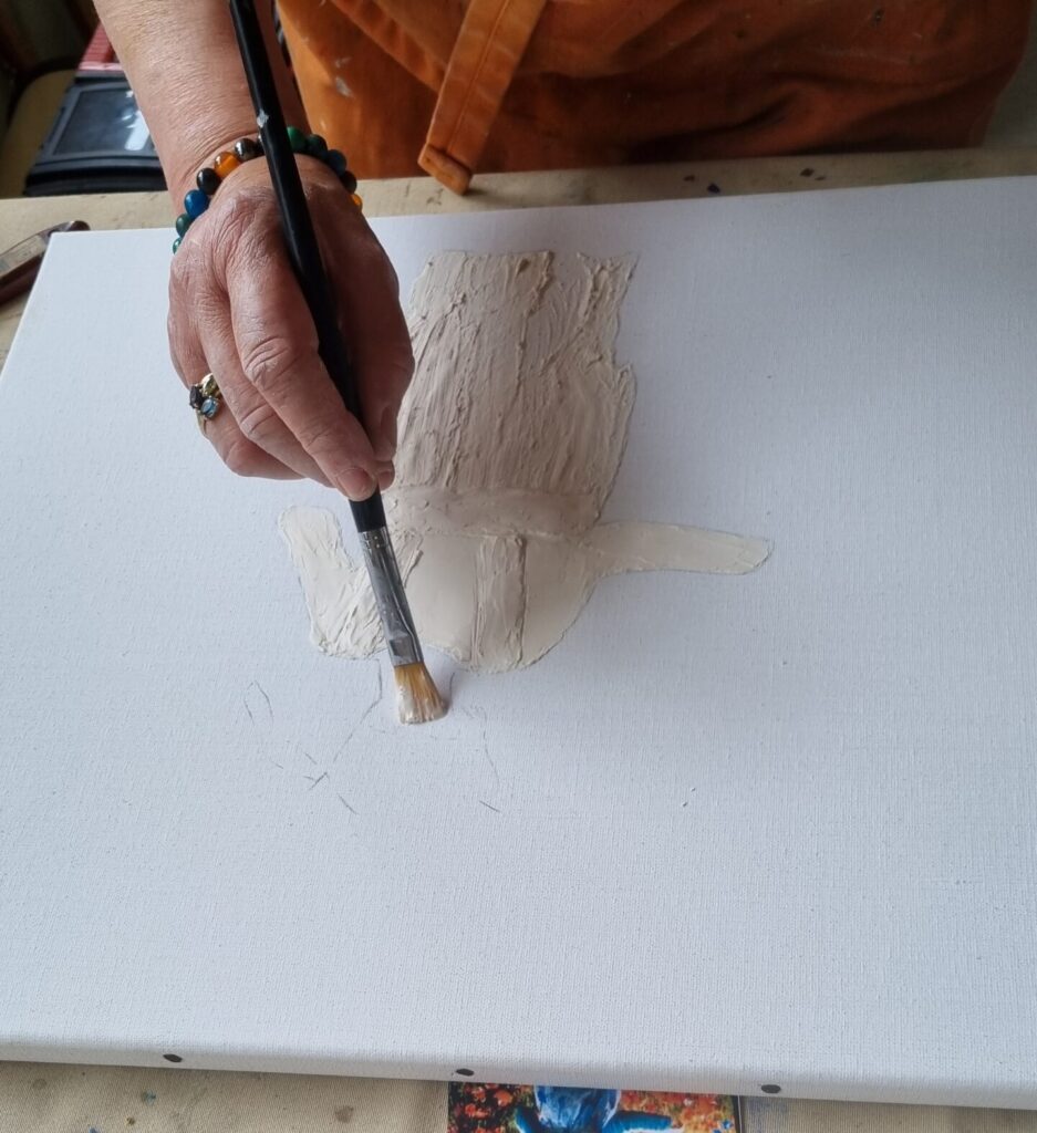 Un dessin est fait au préalable sur une toile ou un carton toilé brut.