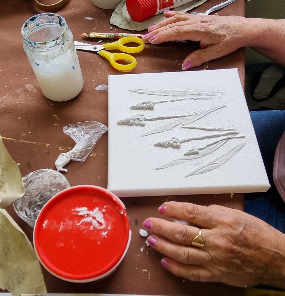 Puis on pose l’enduit de rebouchage à l’aide d’un couteau et on lisse avec un pinceau mouillé à l’eau ou on strie avec toutes sortes d’instruments selon sa fantaisie !