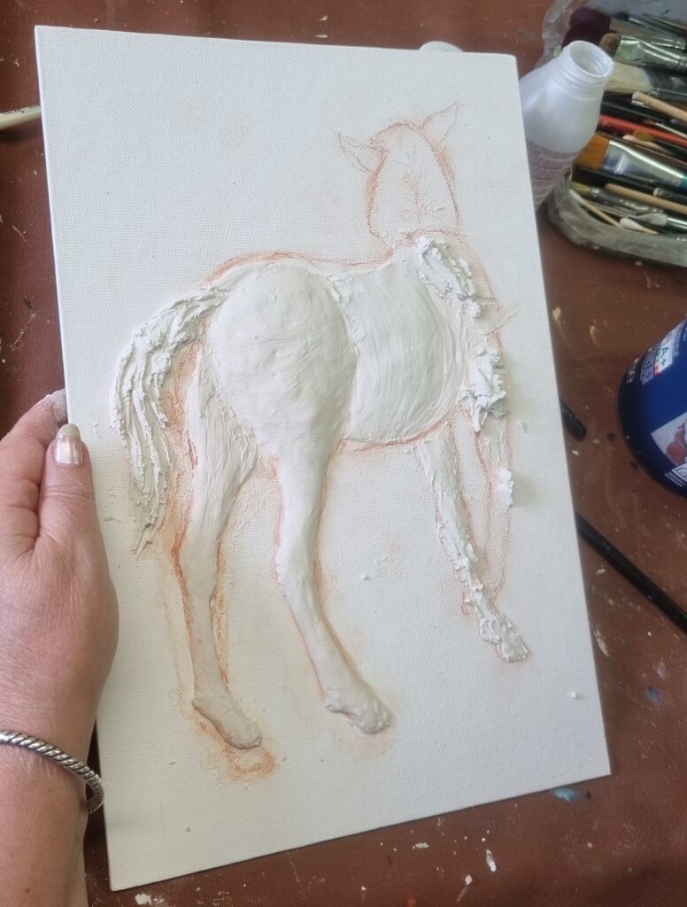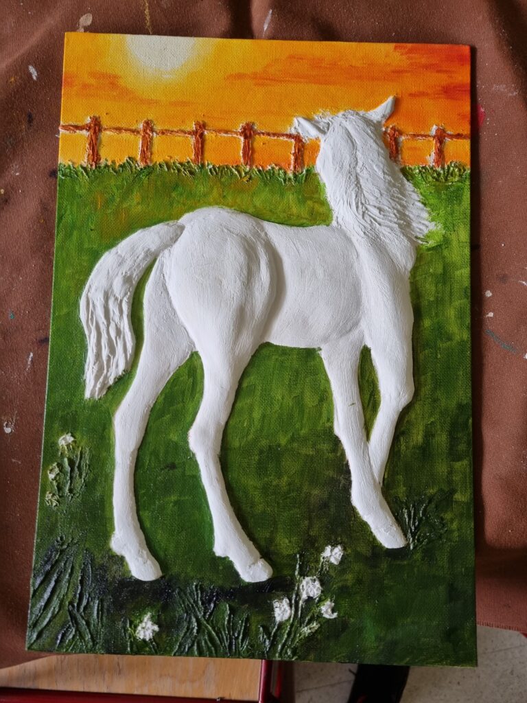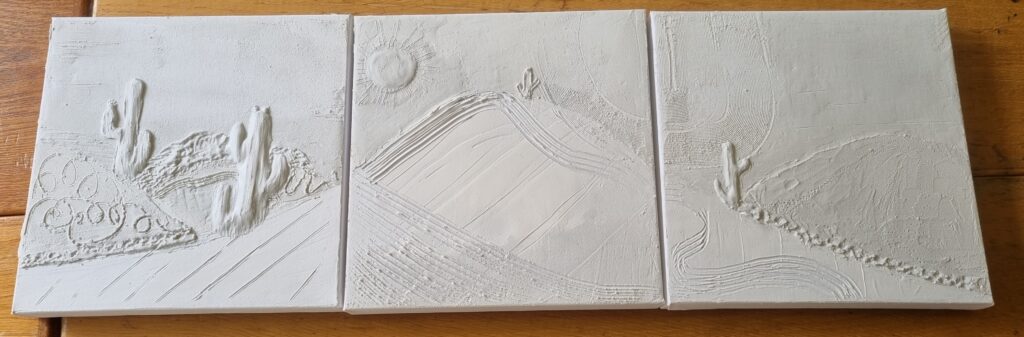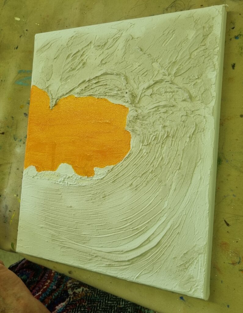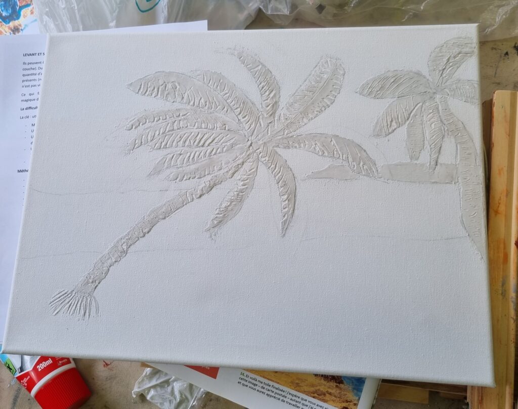 Séchage et ponçage doux éventuel. Ensuite 2 couches d’acrylique blanche suivies par les couleurs de son choix