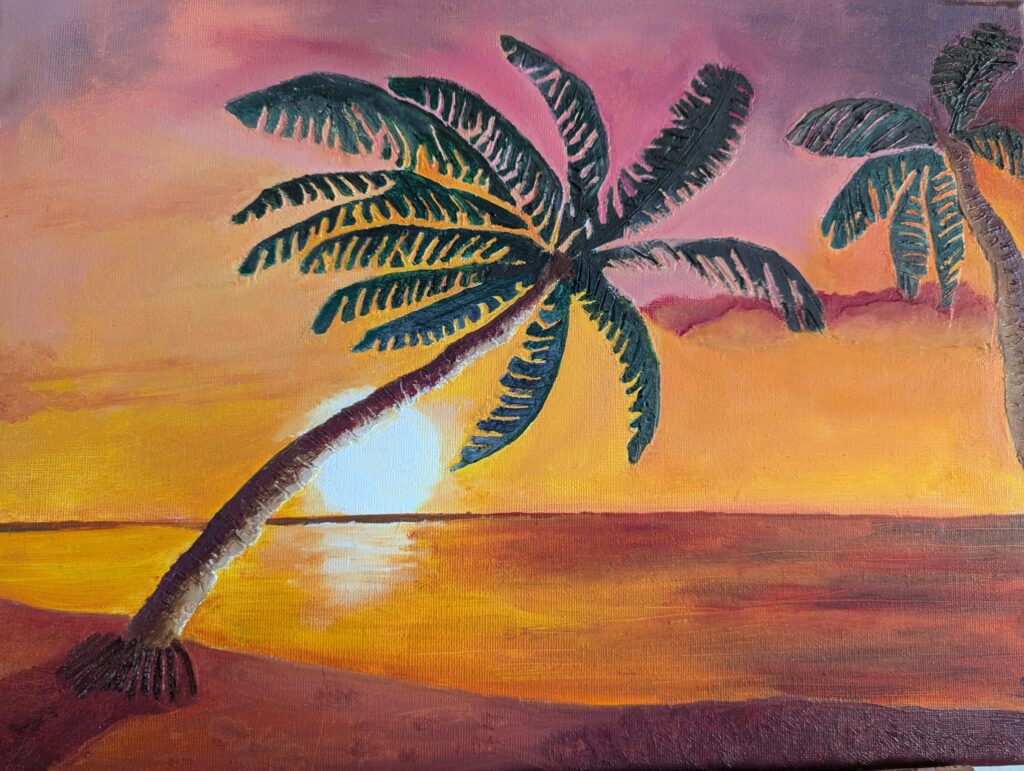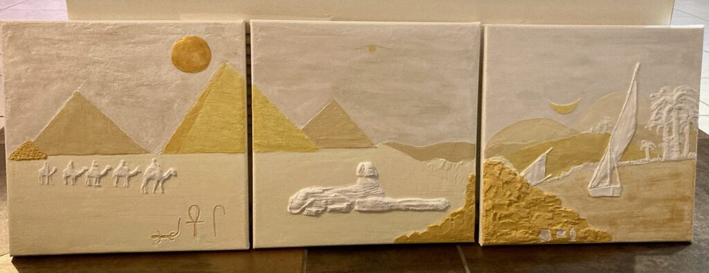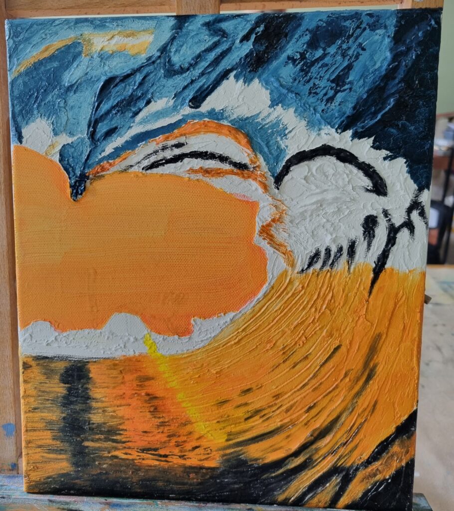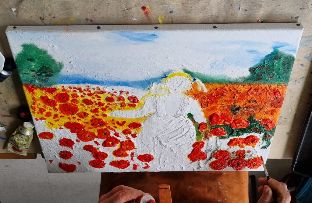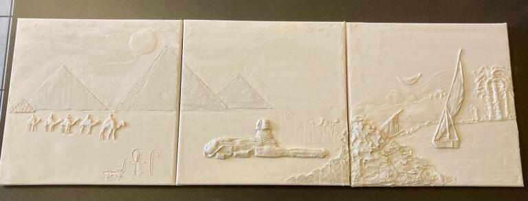 Séchage et ponçage doux éventuel. Ensuite 2 couches d’acrylique blanche suivies par les couleurs de son choix
