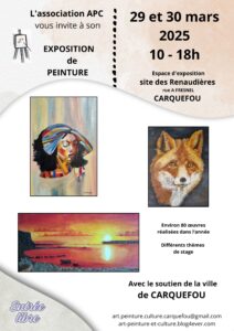 Exposition annuelle aux RENAUDIERES à CARQUEFOU Auteur/autrice de la publication :Crea20telier21ns Publication publiée :24 mars 2025 Post category:Non classé Exposition annuelle les samedi 29 et dimanche 30 mars 2025 de 10 à 18h !Soyez les bienvenus! Nous vous accueillerons avec plaisir ! Environ 80 tableaux réalisés dans l’année par plus de 30 personnes différentes