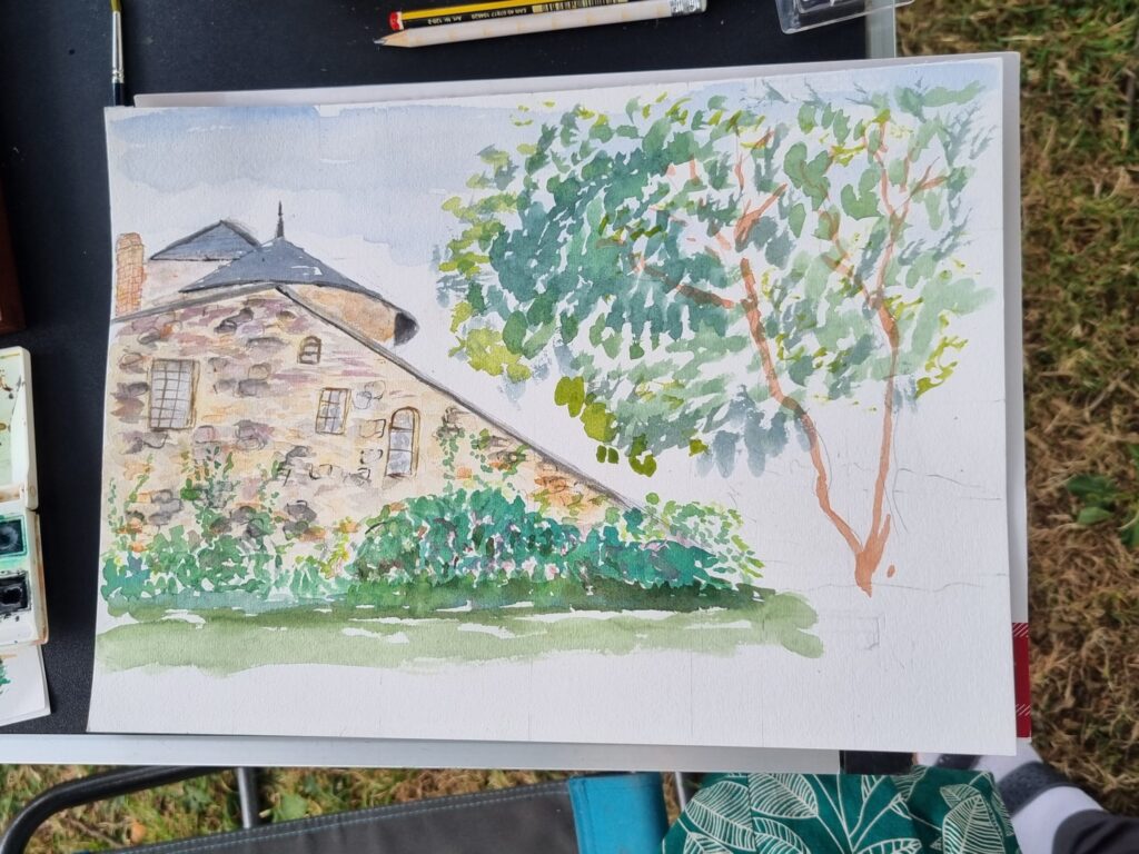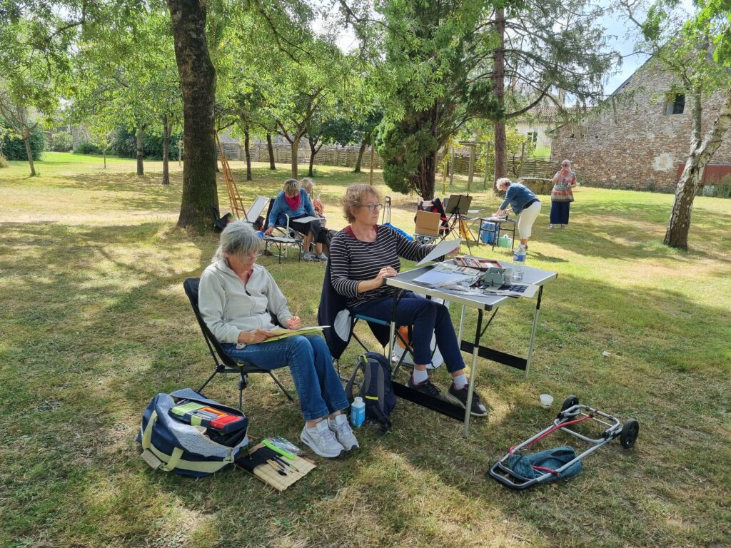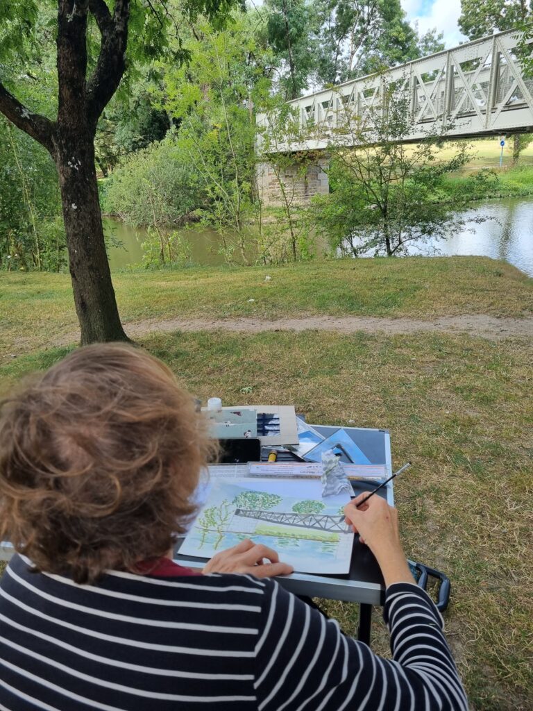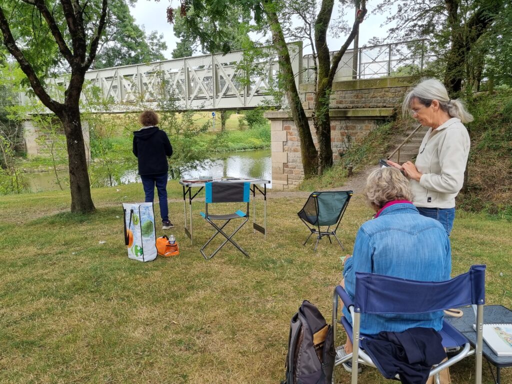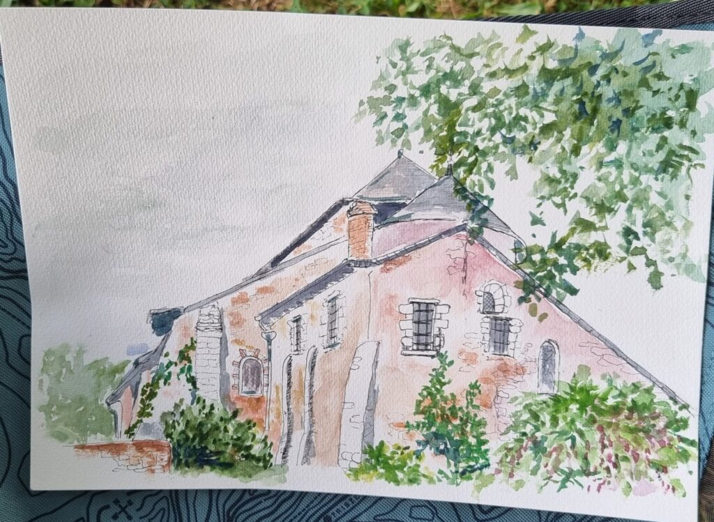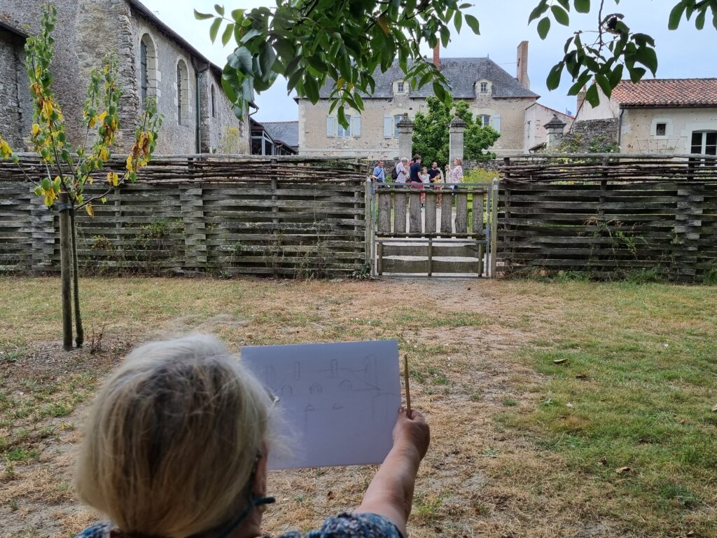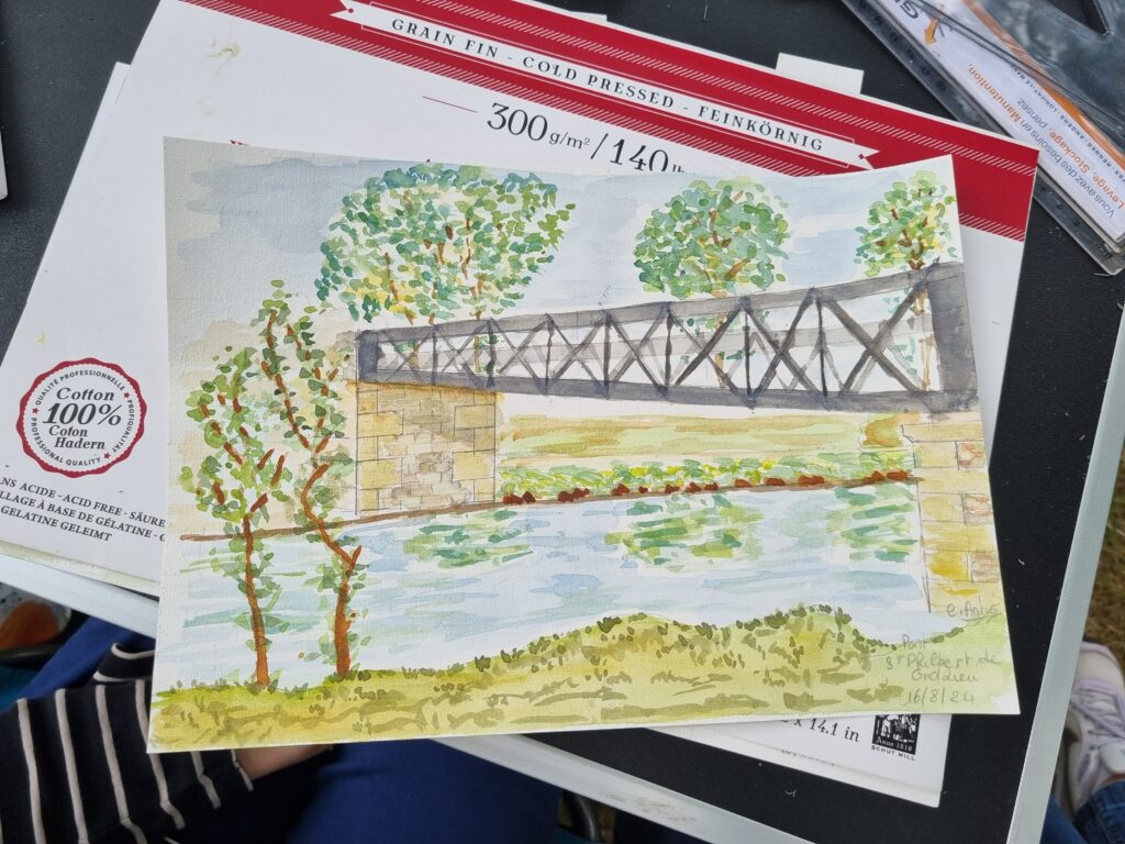 On a repéré le meilleur site pour avoir plusieurs sujets différents à dessiner et à peindre. Notre choix s’est porté sur l’arrière de l ‘abbaye, le jardin des simples et le pont au-dessus de la rivière